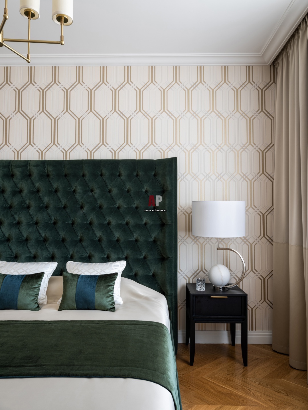 Высокое изголовье кровати выполнено в темном изумрудном цвете. Он выглядит еще более благородным на фоне обоев с золотым геометрическим рисунком. Кровать и тумбочка, Dantone Home.