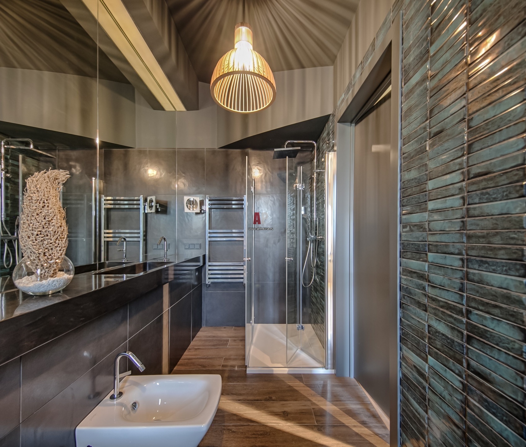 На втором этаже спроектировано три санузла. Все они выполнена в темной, природной палитре.