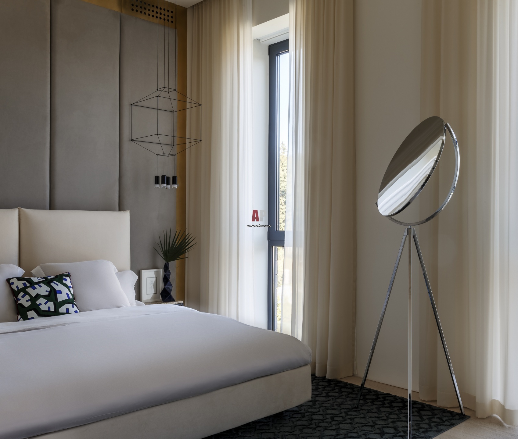 Хозяйская спальня. Окна в спальне, как и во всех помещениях второго этажа, сделаны высокими и узкими. Они дают ощущение защищенности, свет из них льется мягкий, комфортный для отдыха. Постельное белье, Togas.
