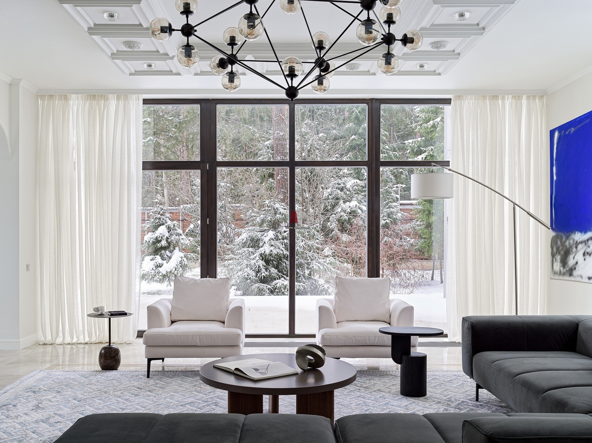 Светлый и воздушный дом в стиле современная классика. Интерьер гостиной. Стилистика – классическая, спокойная, минималистичная. Заказчик хотел, чтобы основные предметы мебели были массивными – диван, обеденный стол, стулья, не просто красивые, но и такие, на которых было бы удобно сидеть.