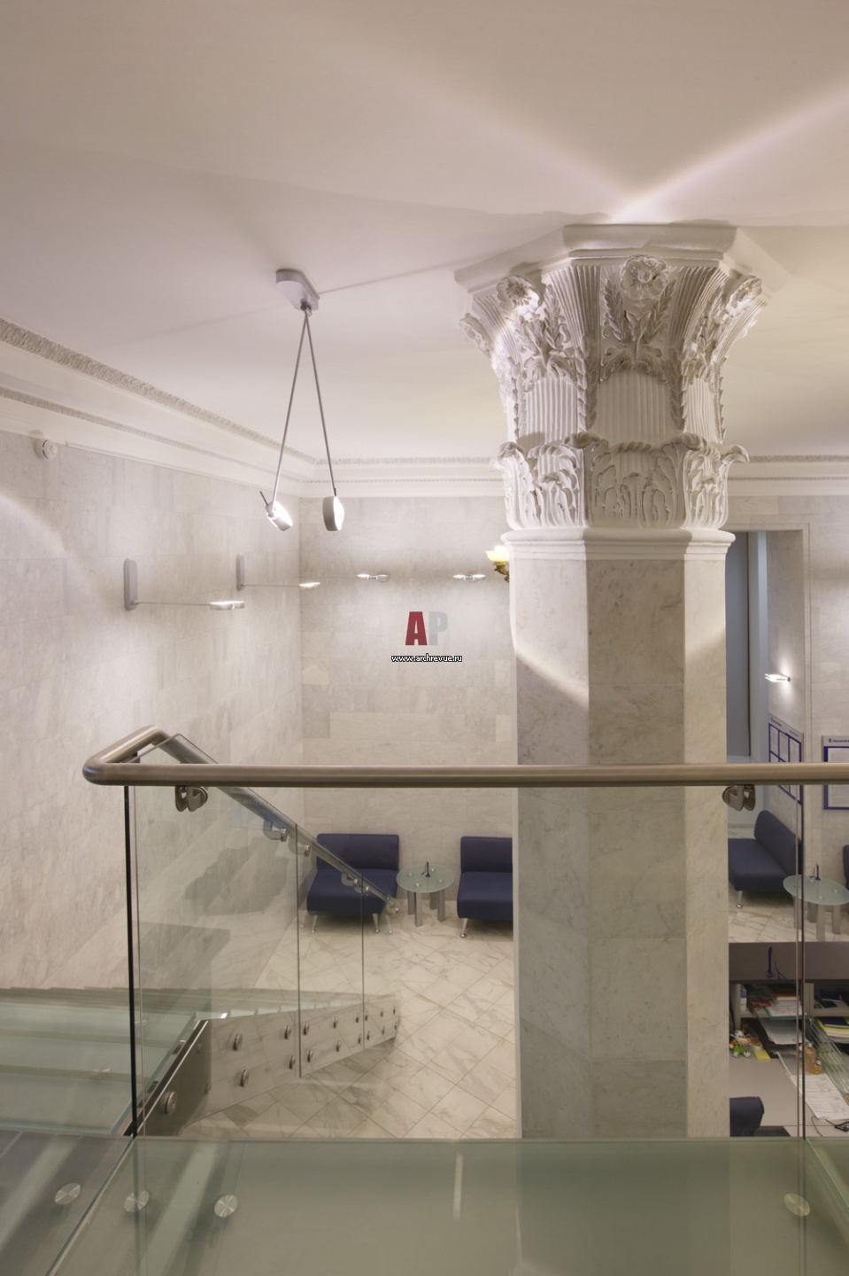 Балкон второго этажа из стекла. Стены приемной и зоны ресепшен, а также мощные несущие колонны облицованы слэбами из белого мрамора с серыми прожилками.