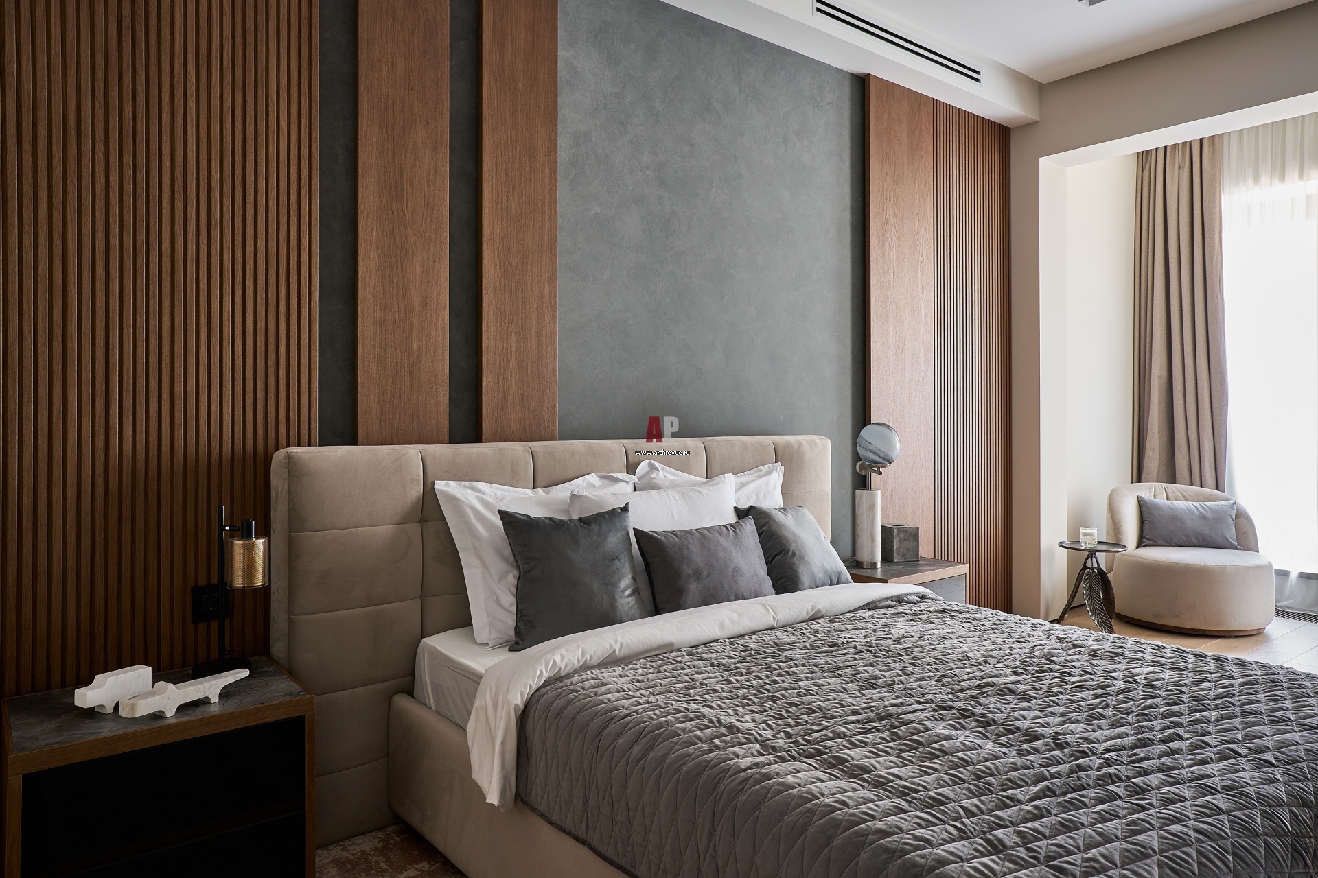 Главная спальня. Зона кровати оформлена шпонированными панелями с вертикальным ритмом. Тумбы с каменной столешницей, на заказ.