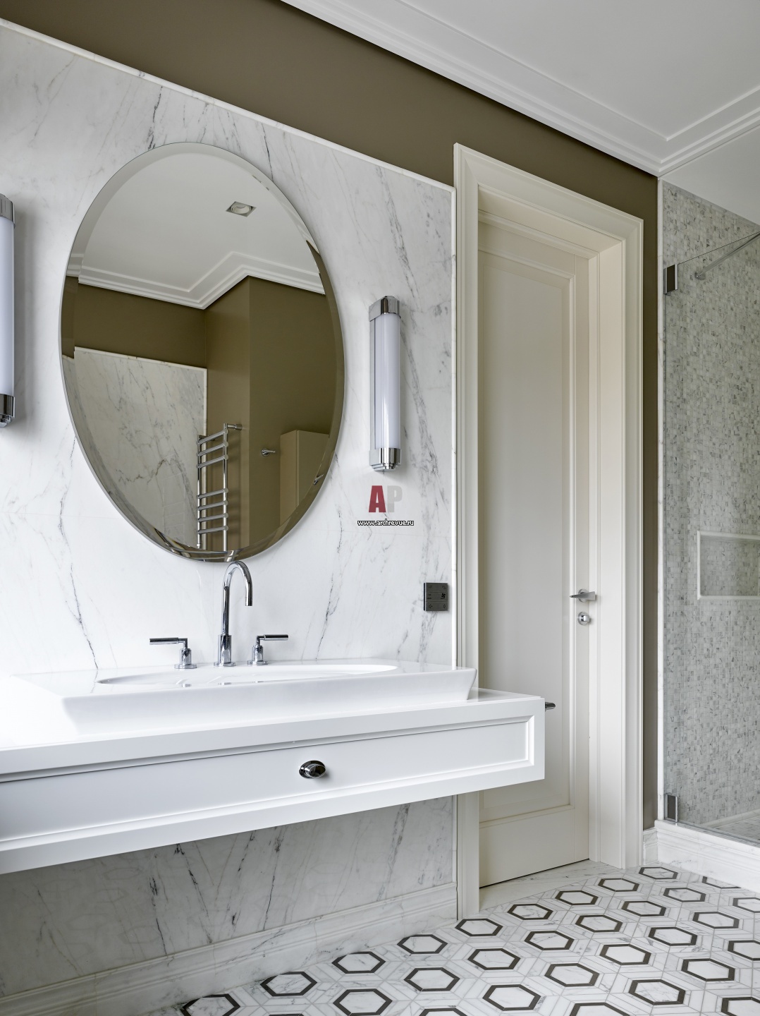 В оформлении ванной комнаты использовался светлый камень. На полу – каменная мозаика с геометрическим орнаментом, панно изготавливалось на заказ. Раковина, Villeroy & Boch.