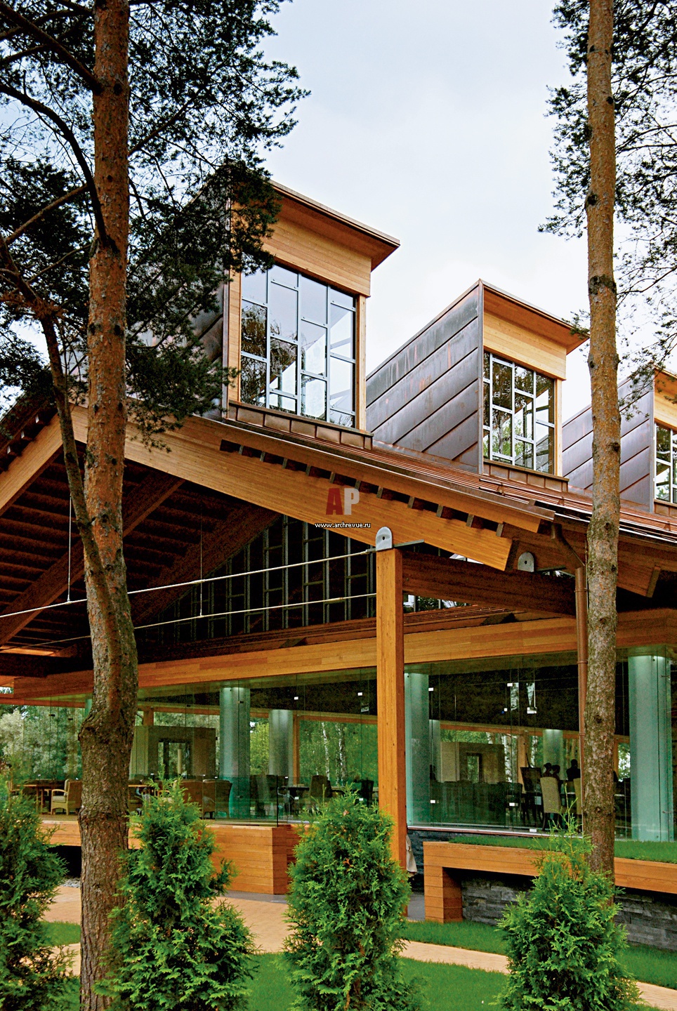 Несущие конструкции и каркас крыши выполнены из клееного дерева. Кровля металлическая - медная по электроизоляционному материалу. Кровля террасы выполнена из стекла.