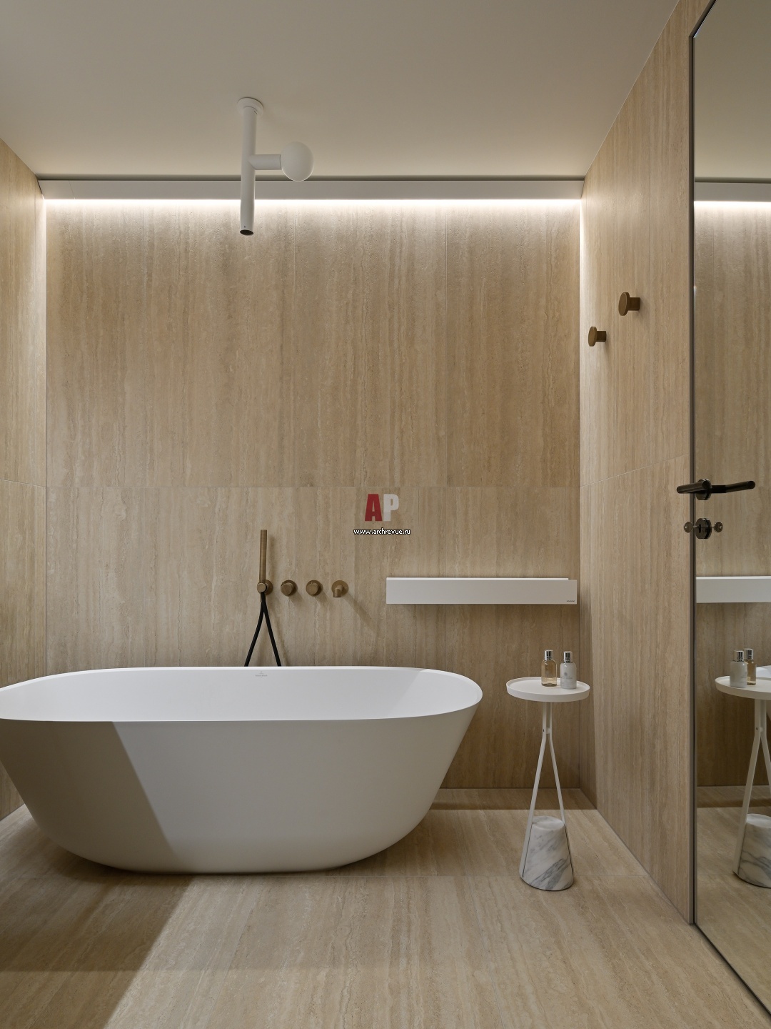 Ванная комната дочери оформлена в теплых песочных оттенках. Из «фишек» - отдельностоящая ванна, эффектный светящийся душ, вмонтированный в потолок, зеркальная дверь.
