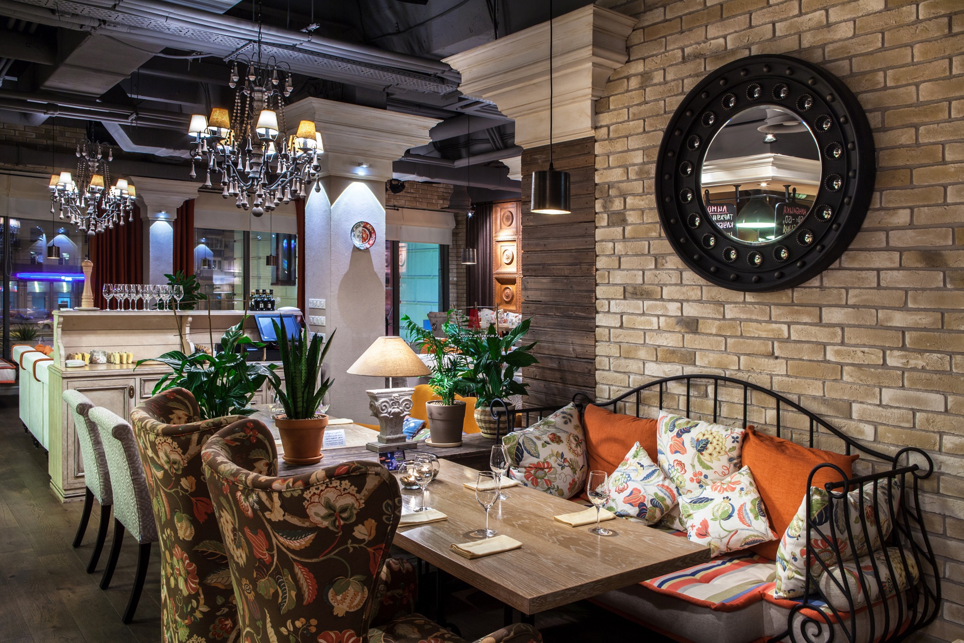 Фото интерьера зала ресторана в духе винтажный лофт. На фоне брутальной кирпичной кладки стен эффектно смотрятся черные кованые диваны. Они сделаны на заказ под проект.