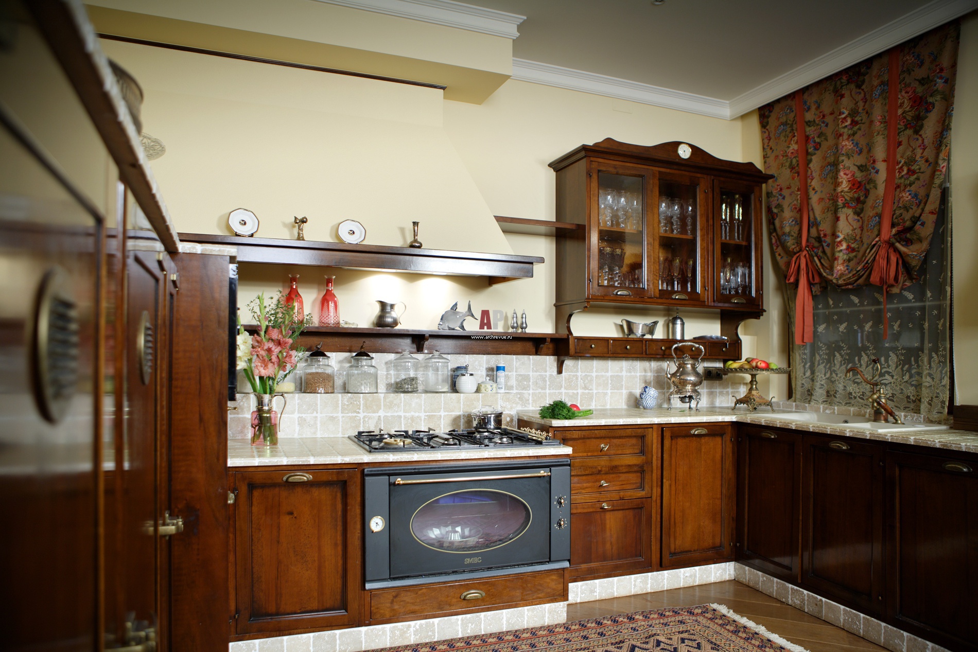 Кухня выполнена в стилистике кантри. Этому служит мебельный гарнитур с характерной для кантри отделкой, оформление кухонного фартука плиткой с состаренной фактурой, а также яркий текстиль с растительным орнаментом.
