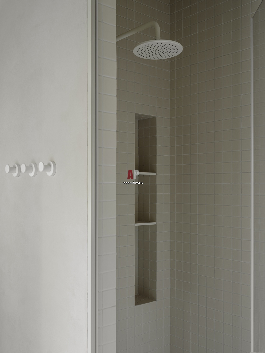 Белая квартира в эстетике авангарда для молодого человека. Душевая в хозяйском санузле. Отделка стен в ванной и оконных откосов в гостиной керамической плиткой с мелким квадратом не спроста: она перекликается с ритмом окон Дома Мельникова.