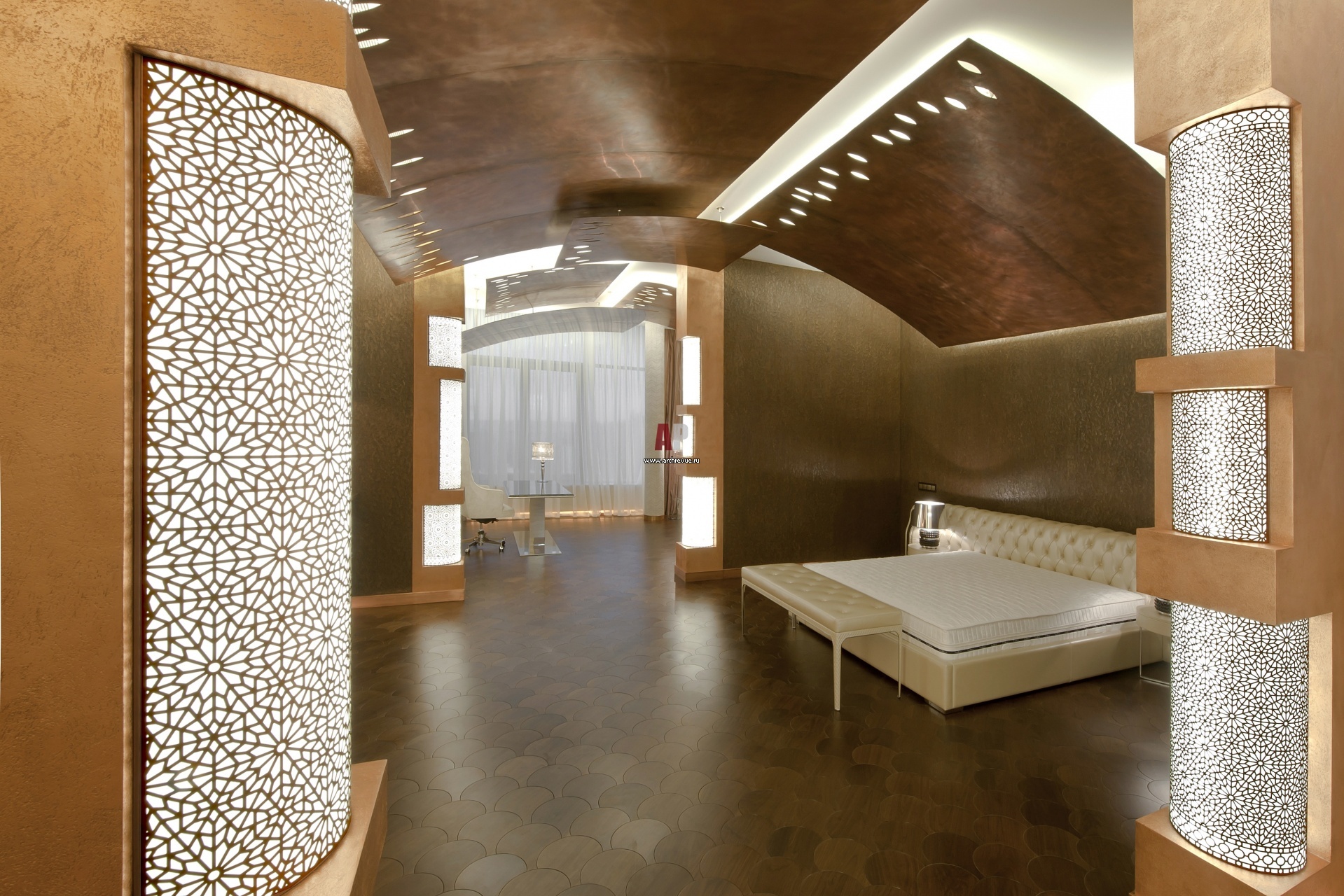 Интерьер одной из гостевых спален. Потолок декорирован подвесными радиусными панелями из перфорированной меди. На стенах - 3D-панели из камня. Кровать, Rugiano.
