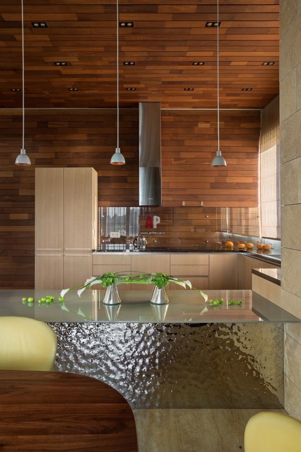 Дом на Волге с природными мотивами. Интерьер кухни. Основание кухонного острова выполнено из нержавеющей стали, столешница – прозрачное стекло. Подвесные светильники, Louis Poulsen.
