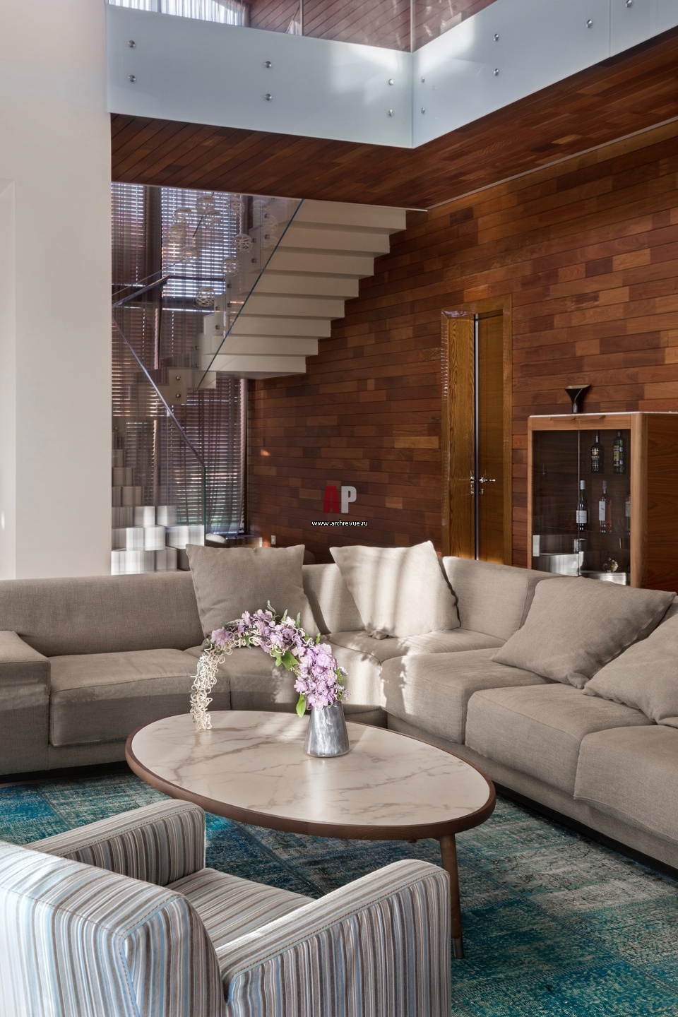 Интерьер двухэтажного загородного дома с речной панорамой