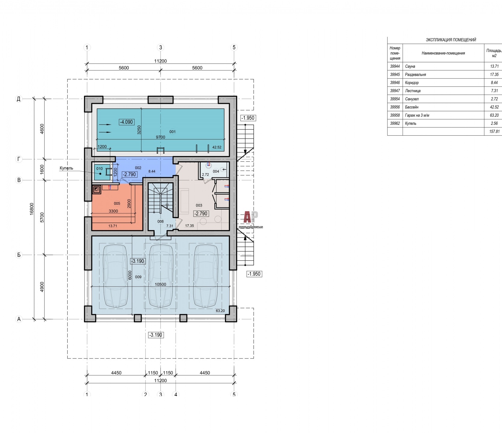 План цоколя пятиэтажного дома из кело. Общая площадь – 1054 кв. м. Жилая площадь – 700 кв. м. Высота дома от нулевой отметки в коньке 13.000 и -5600 вниз.