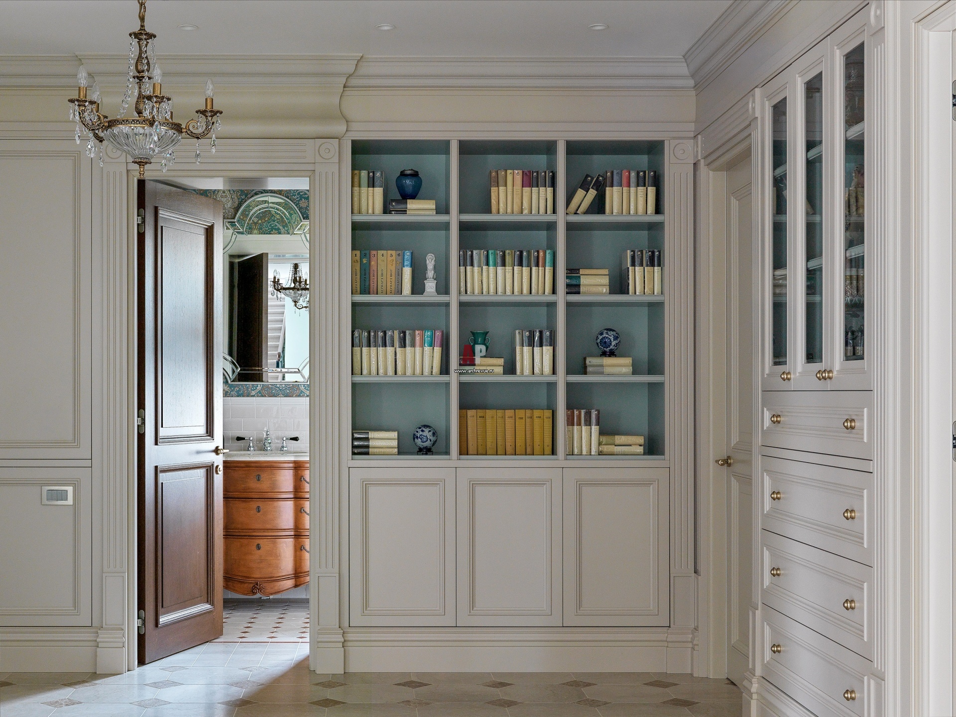 Вид из холла с библиотекой на гостевой санузел. В комплекс секций библиотеки вписан камин, который был на этом месте всегда. Шкафы сделаны на заказ.