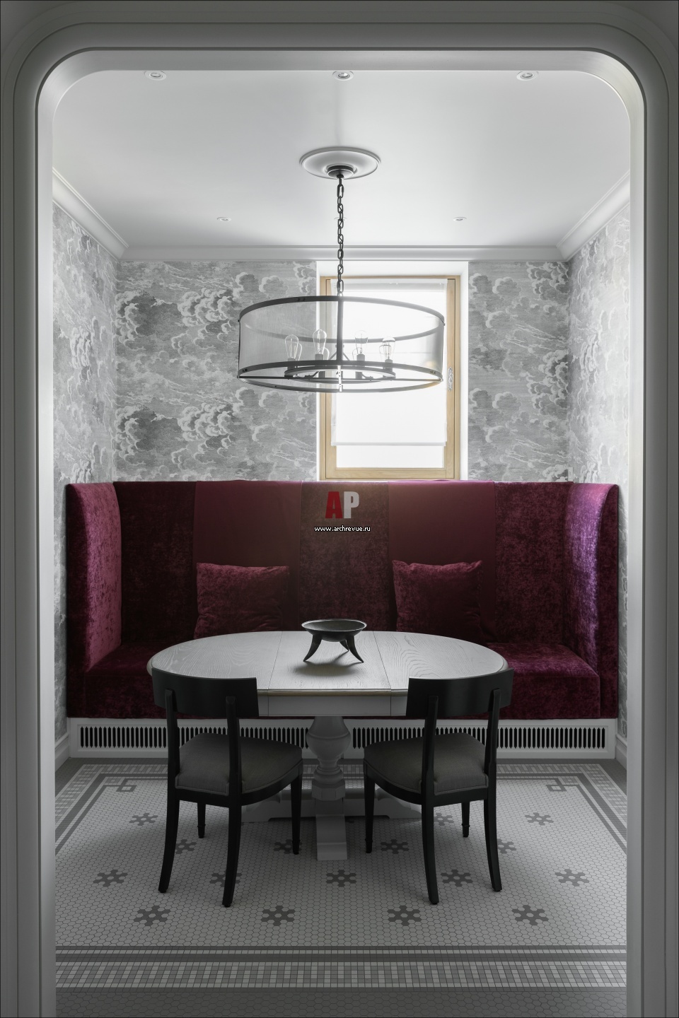 Зона для завтраков на кухне. Центральный элемент – удобный диван с высокой спинкой, обитый лиловым бархатом. На стенах – серебристо-жемчужные обои ручной работы, на полу – каменная мозаика того же оттенка.