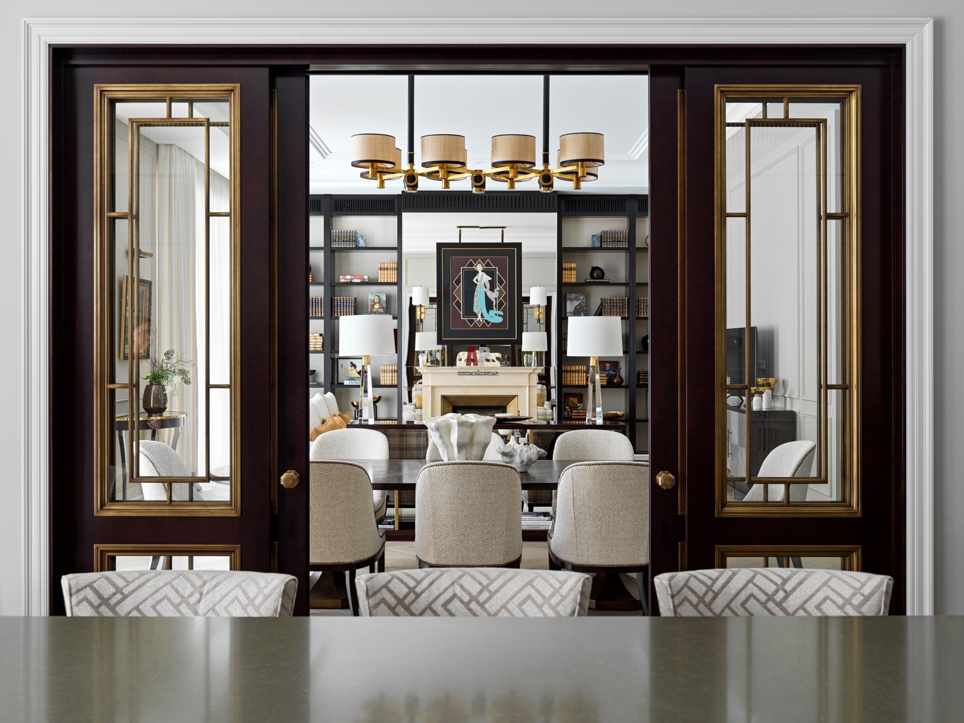 Зоны в общем пространстве первого этажа отделяют авторские двери в стиле ар-деко из темного дерева с прозрачными витражами и латунной отделкой. Над камином – работа Эрте «Калифорния».
