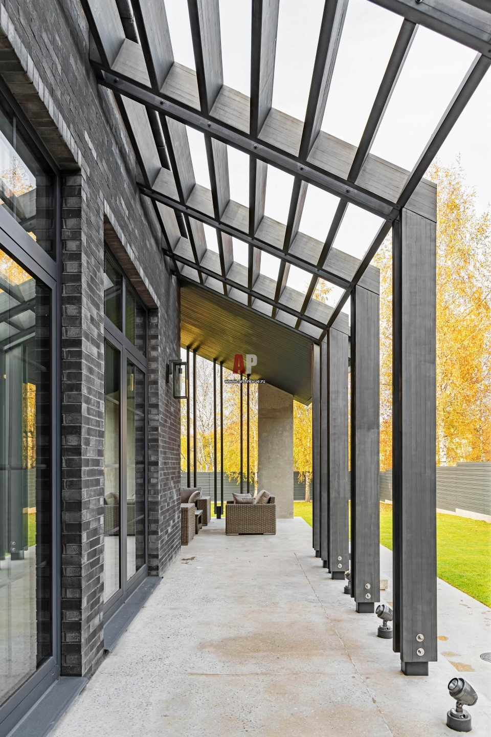 Одноэтажный дом в поселке Дарьино с серым фасадом и колоритным интерьером