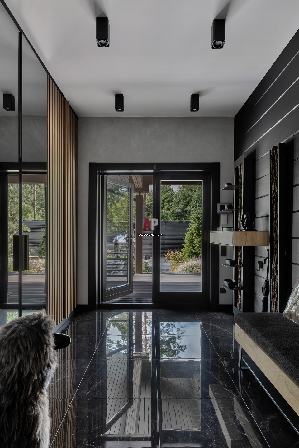 Входная группа. Шкаф с зеркальным фасадом, реечные стеновые панели из светлого дуба сделаны на заказ. Полки, Hartmann, коллекция Runa. Банкетки, Duwel.