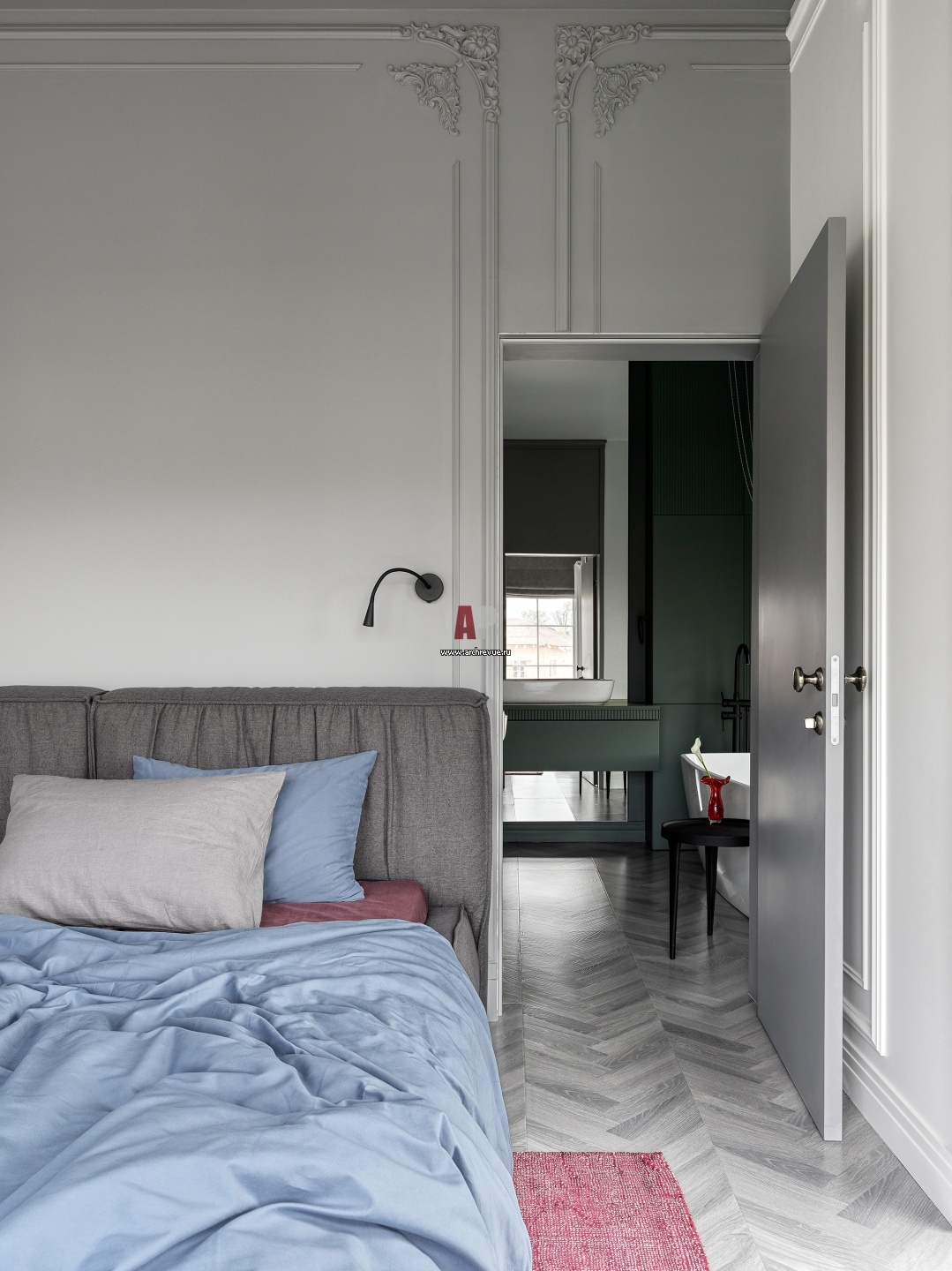Мастер-спальня. На стенах – лепные молдинги с лаконичным неоклассическим узором.