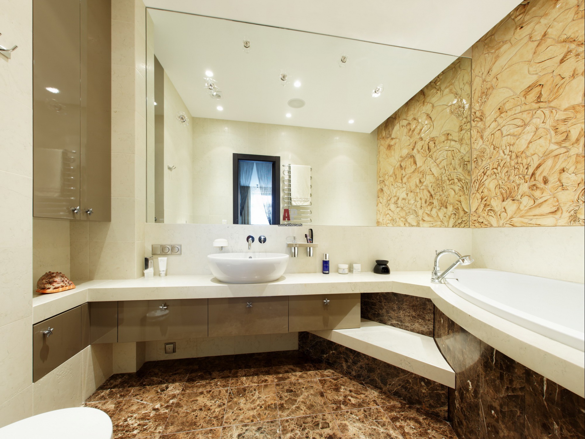 Главный санузел облицован мрамором. Одна из стен оформлена сделанным по эскизам художников компании «Мастерская керамики и скульптуры» рельефным керамическим панно с изображением фантазийного подводного мира.