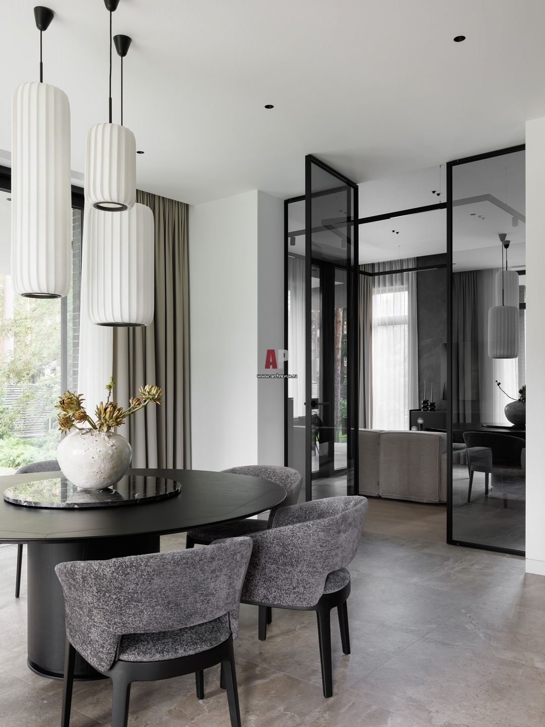 Кухня и столовая – полностью единое пространство, отделенной от гостиной стеклянной перегородкой. При полностью отрытых дверях из столовой видна зона отдыха, камин с живым огнем и даже большой телевизор.
