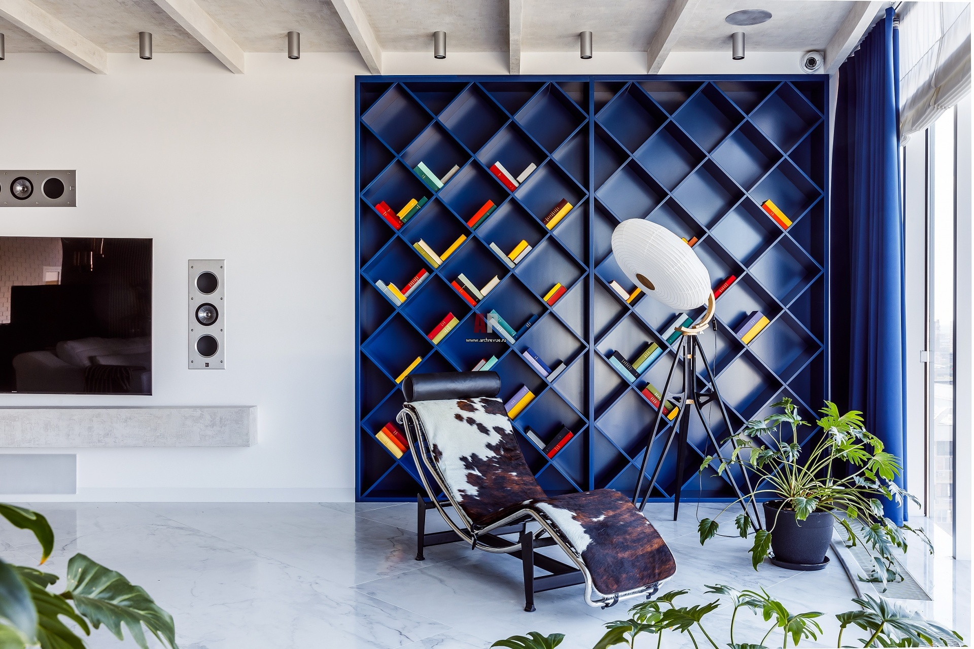Стена напротив дивана сделана акцентной. Стеллаж насыщенного синего цвет изготовлен на заказ по эскизам авторов проекта. Интерьерный шезлонг Cassina, модель LC4. Напольный светильник Stellar Works, модель Kyoto Floor Lamp.