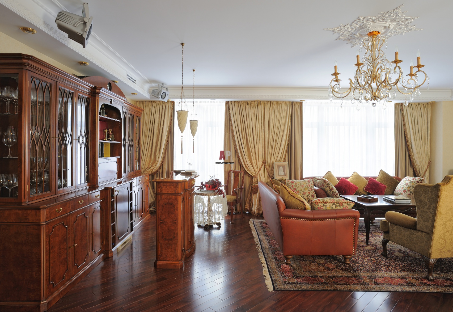 В классическом интерьере гостиной с соответствующим пышным антуражем дизайнер спрятала систему домашнего кинотеатра с выдвижным экраном профессиональной акустикой и система проигрывания виниловых пластинок. Витрина с баром из шпона ореха, куда встроена техника для хранения вин, образует зону отдыха.
