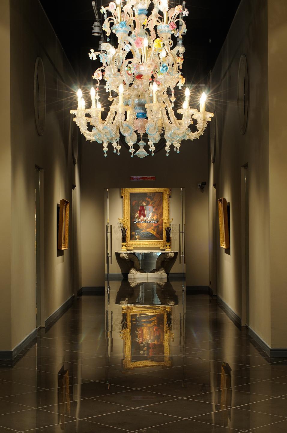 Длинным коридором галерея идет от зоны ресепшен до так называемого «разводного фойе» с гигантской люстрой, откуда посетитель может попасть в залы музея, расположенные по обе стороны от галереи, и дальше до самого большого и высокого зала.