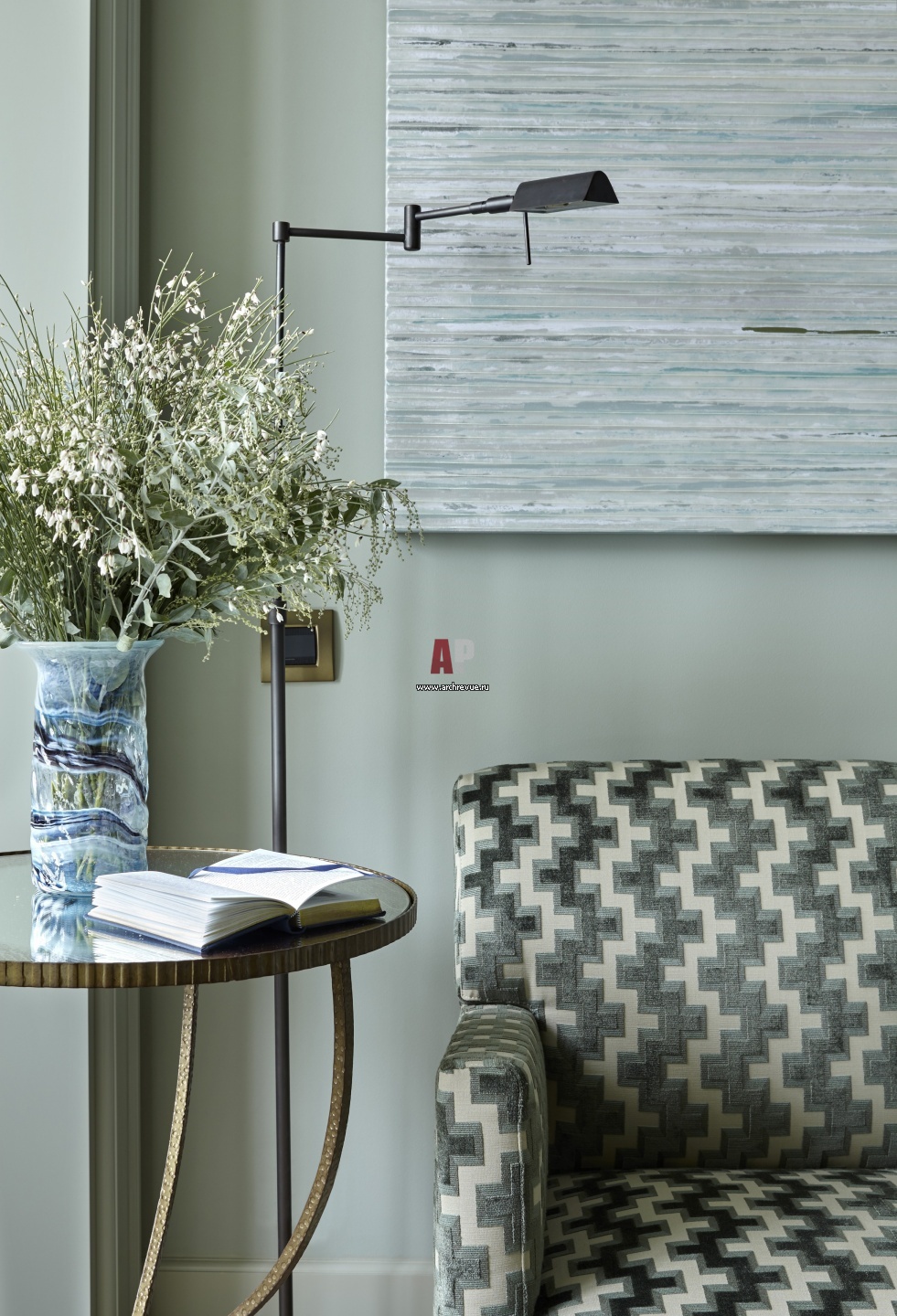 Зона отдыха в бирюзовой спальне. Кресло, Marie's Corner перетянуто в ткань Zoffany. Столик Crate and Barrel. Торшер, Charrell.