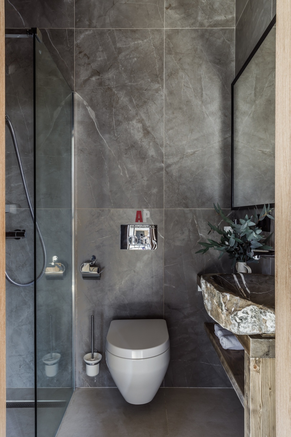 Гостевой санузел на первом этаже имеет небольшую площадь, его стены и пол оформлены темно-серым крупноформатным керамогранитом с фактурой камня. Инсталляции, Geberit.