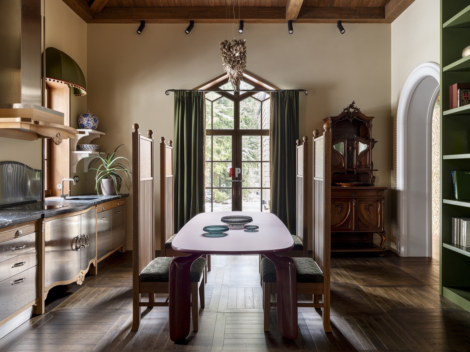 Кухня-столовая. Стол, Roche Bobois. Стулья изготовлены на заказ по мотивам изделий в стиле ар-деко Фрэнка Ллойда Райта. Люстра Vetvi Store, коллекция Evo. Буфет в технике Liege, антикварный, XIX век, Франция.