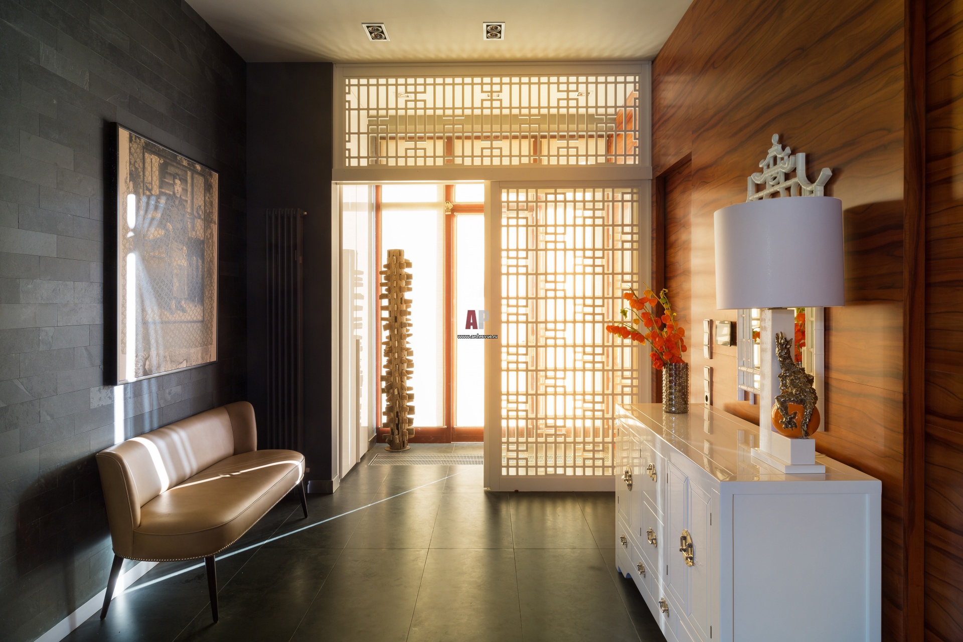 Интерьер прихожей. Одна стена облицована горизонтальными плитами серого сланца, другая – деревянными буазери. Ажурные восточные перегородки пропускают свет.
