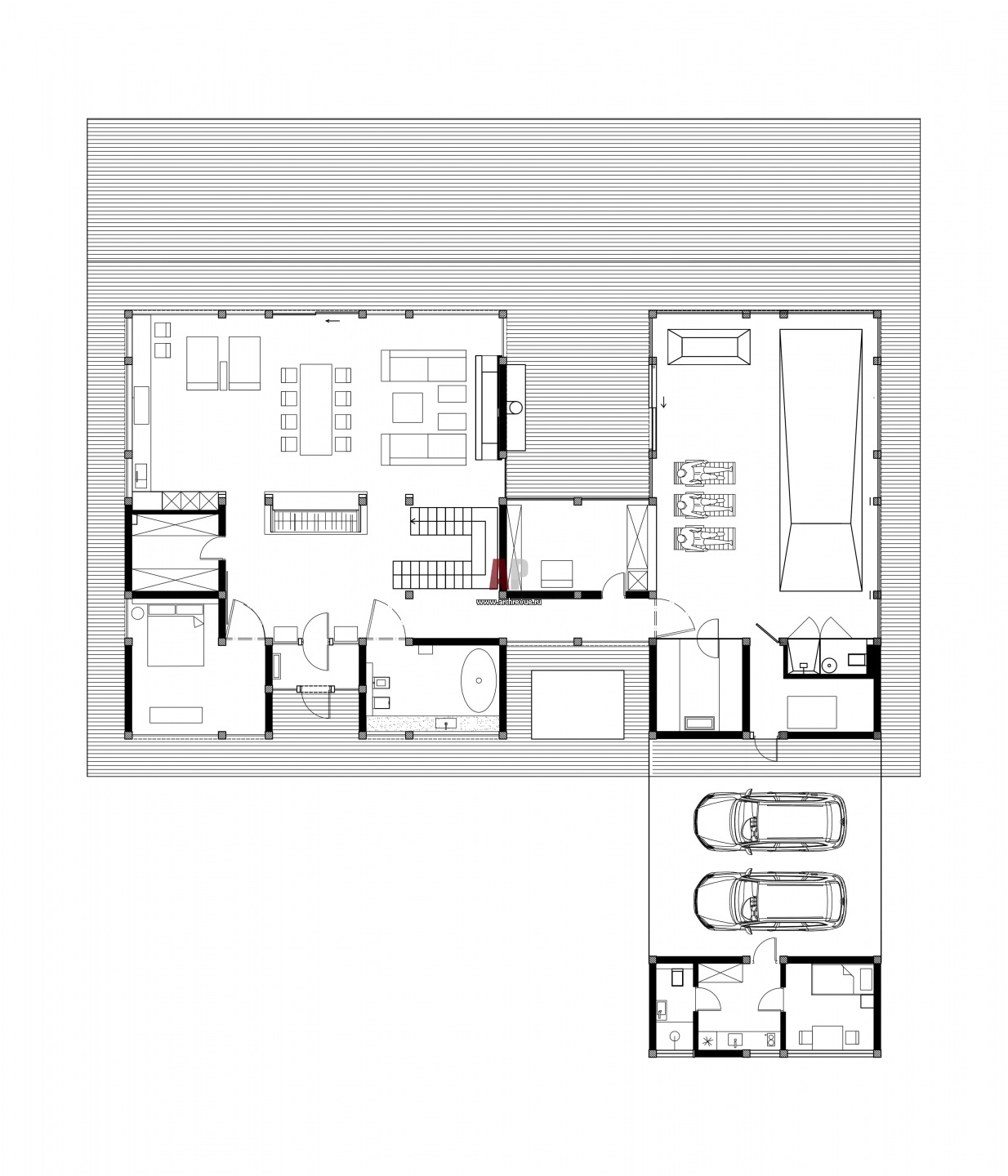План первого этажа двухэтажного фахверкового дома с панорамным остеклением. Общая площадь – 475 кв. м.