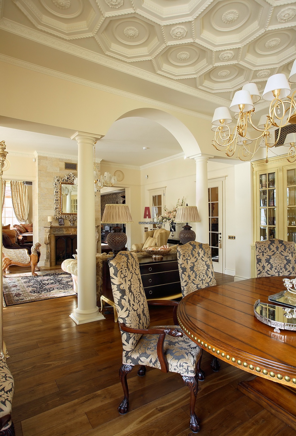 Полы в общественных помещениях первого этажа выложены дубовой доской. Ее простота еще больше акцентирует роскошную сущность интерьера.