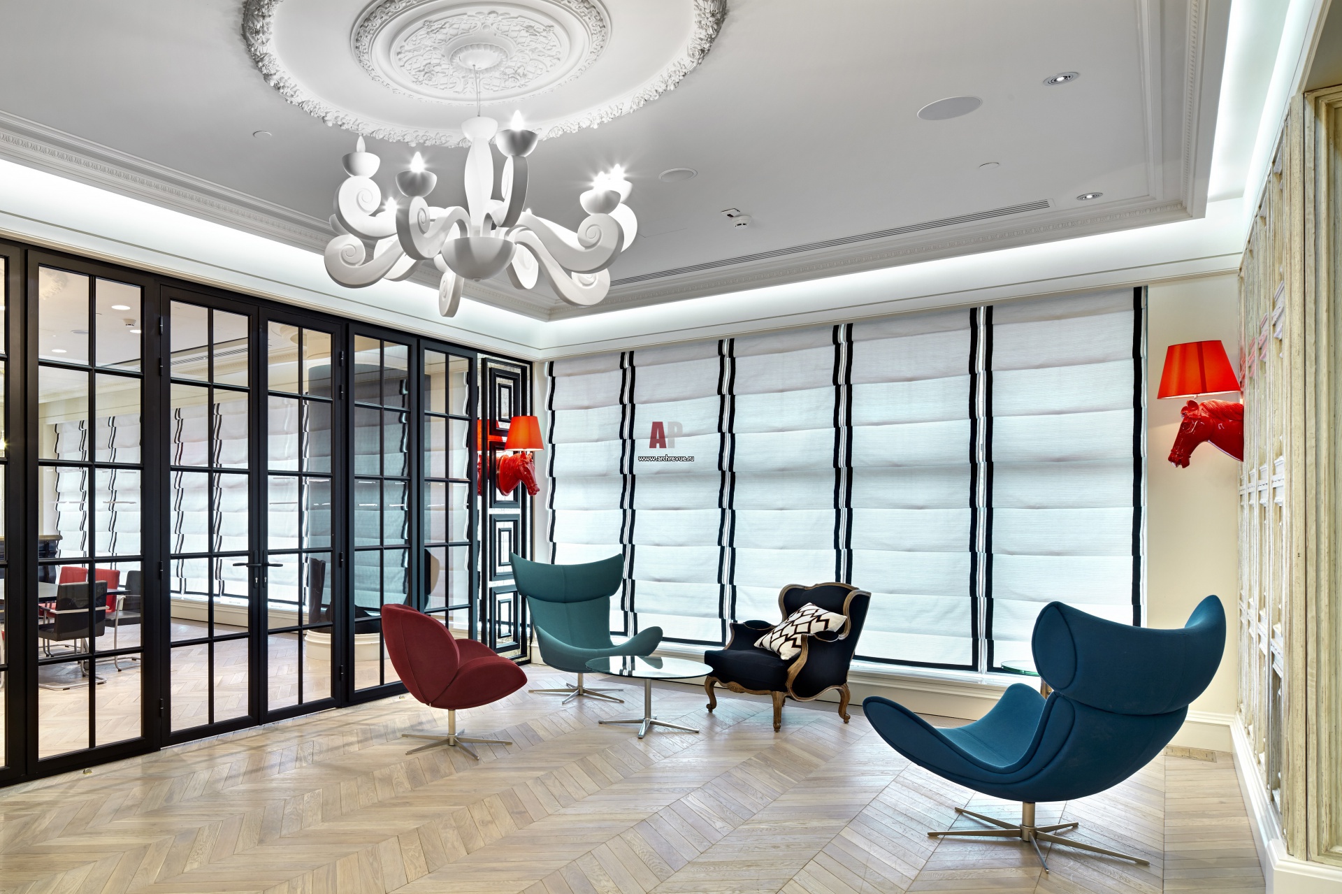 Сами архитекторы называют интерьер офиса «парижская квартира». Стилистику буржуазного фьюжн поддерживают состаренный парект «елочкой», неоклассическая стеклянная перегородка и яркая авангардная мебель.