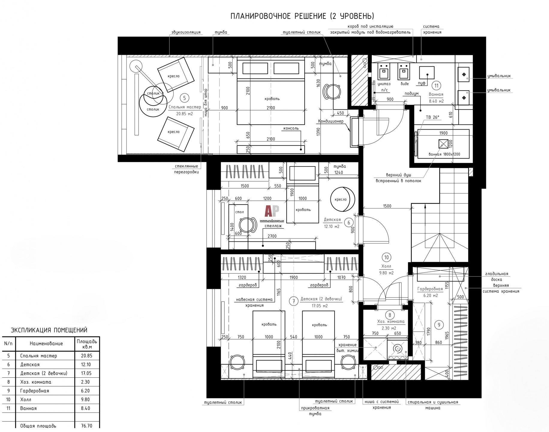 Планировка 2 этажа 2-х этажного пентхауса для семьи с детьми в Москве.