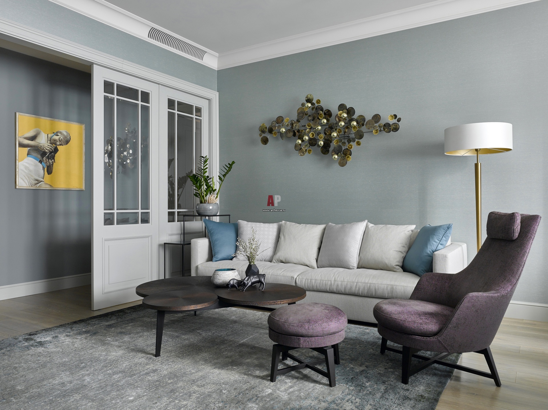В парадной зоне сделан акцент на проверенные итальянские бренды. Кресло с банкеткой, Flexform. Столик, The Sofa & Chair Company. Диван, Meridiani. Панно из металла, Artisan House. В холле – картина Нины Петровой.