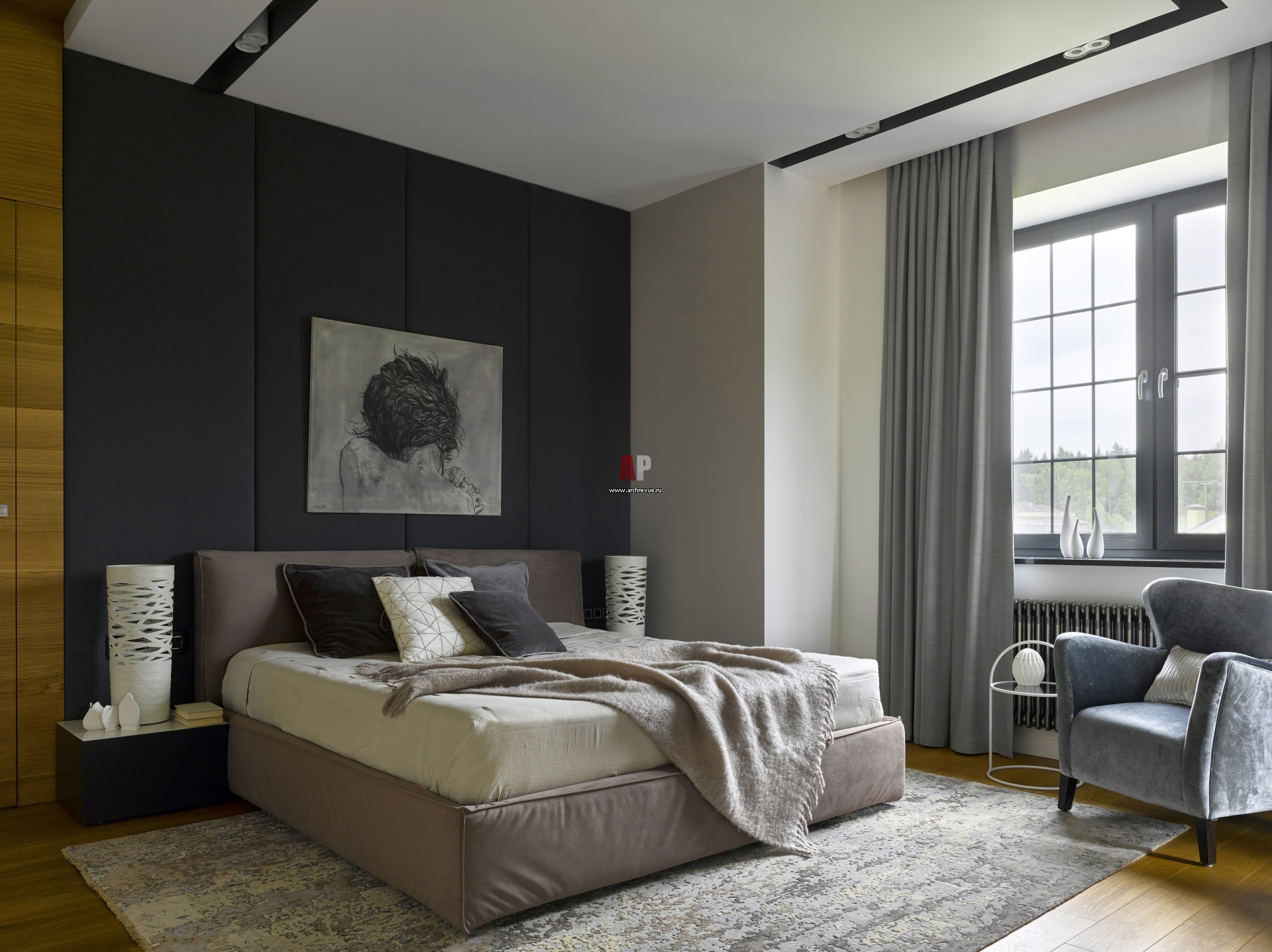 Хозяйская спальня с монохромным дизайном. Стена и потолок оформлены паркетной доской из золотистого дуба. Стена за изголовьем зашита темными текстильными панелями. Они сделаны на заказ под размер, в них предусмотрены защитные отверстия для розеток и выключателей. Напротив кровати – выход на балкон и дверь в санузел при спальне.