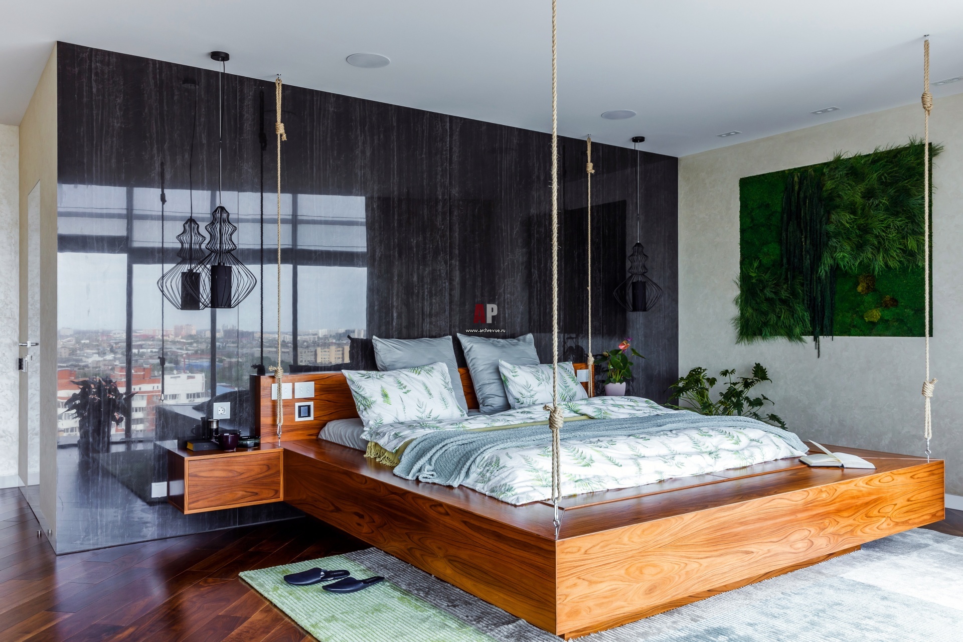 Стена за подвесной кроватью в хозяйской спальне облицована керлитом 1000х3000 см. Кровать, прикроватные тумбы сделаны на заказ.