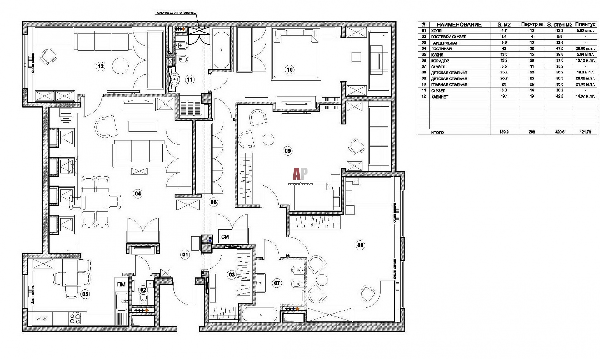 План квартиры площадью 189, 9 кв. м для семьи из четырех человек.