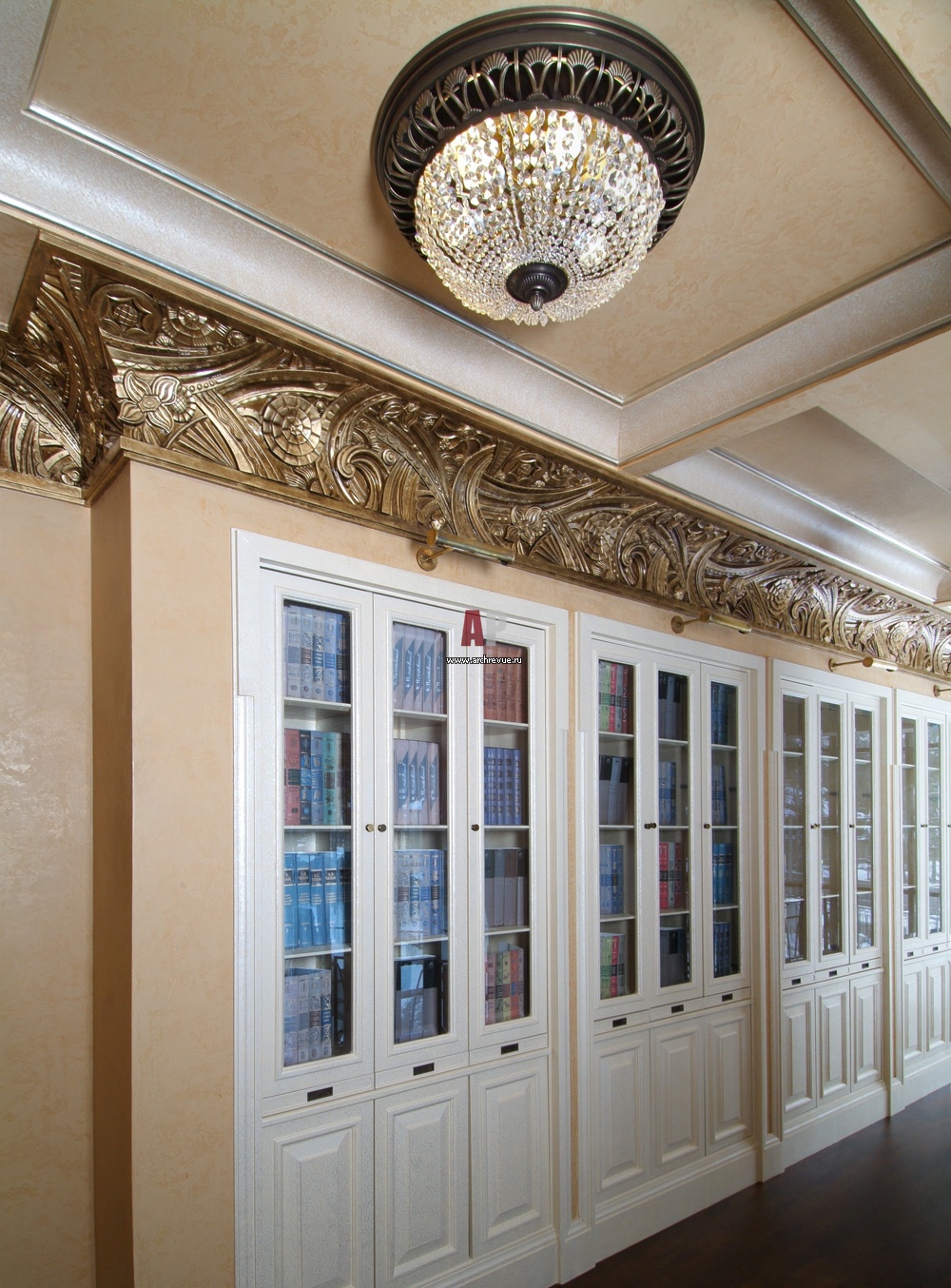 Над просторной общей зоной, на балконе, куда ведет изящная винтовая лестница, расположена библиотека. Винтовая лестница выполнена по авторским эскизам, компанией «Арт-Феррум »