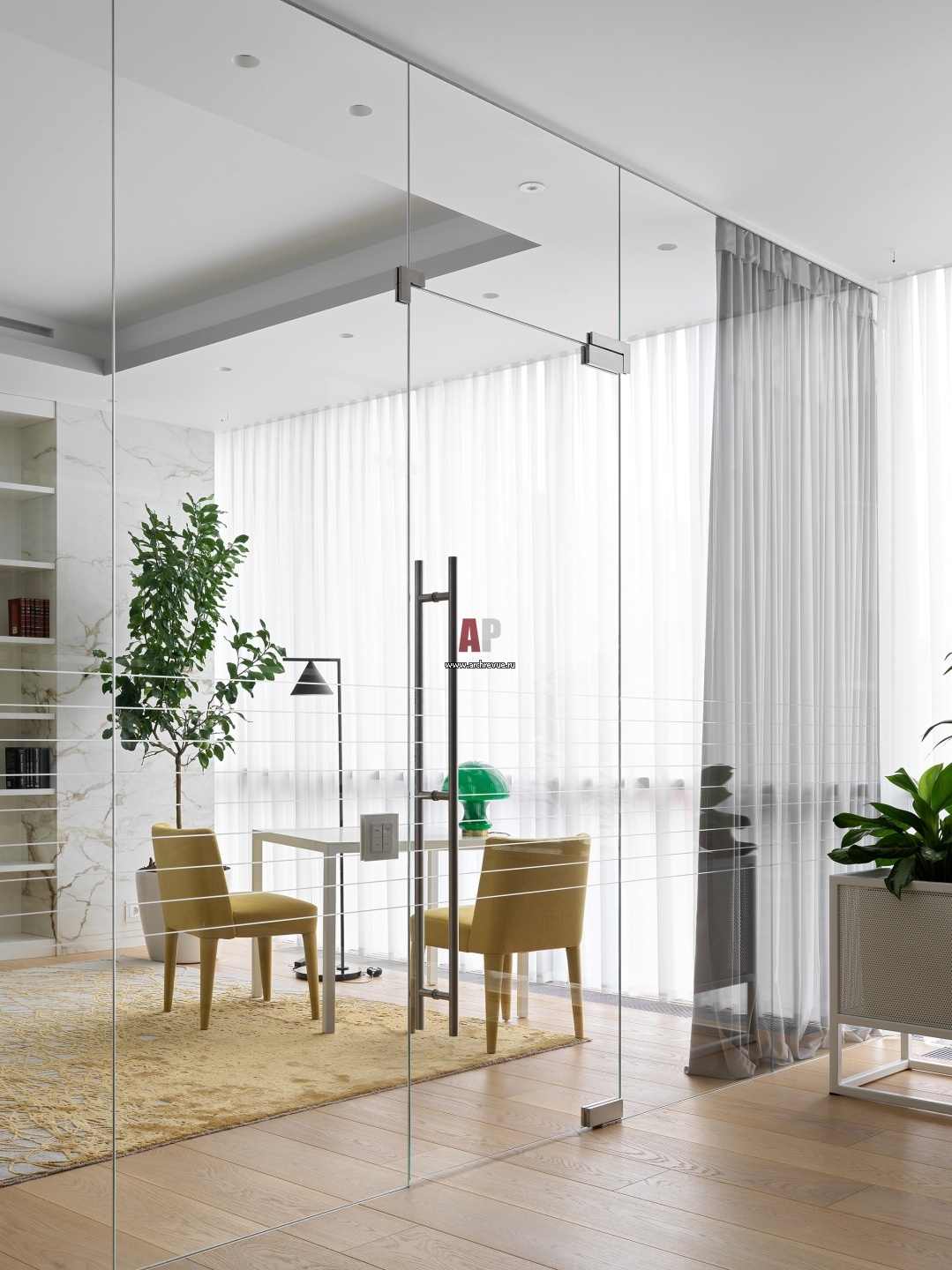 Вид из гостиной на кабинет. Стеклянная перегородка имеет горизонтальный рисунок, чтобы в темноте передвигаться по квартире было безопасно. Стулья, Meridiani. Стол, Poliform.