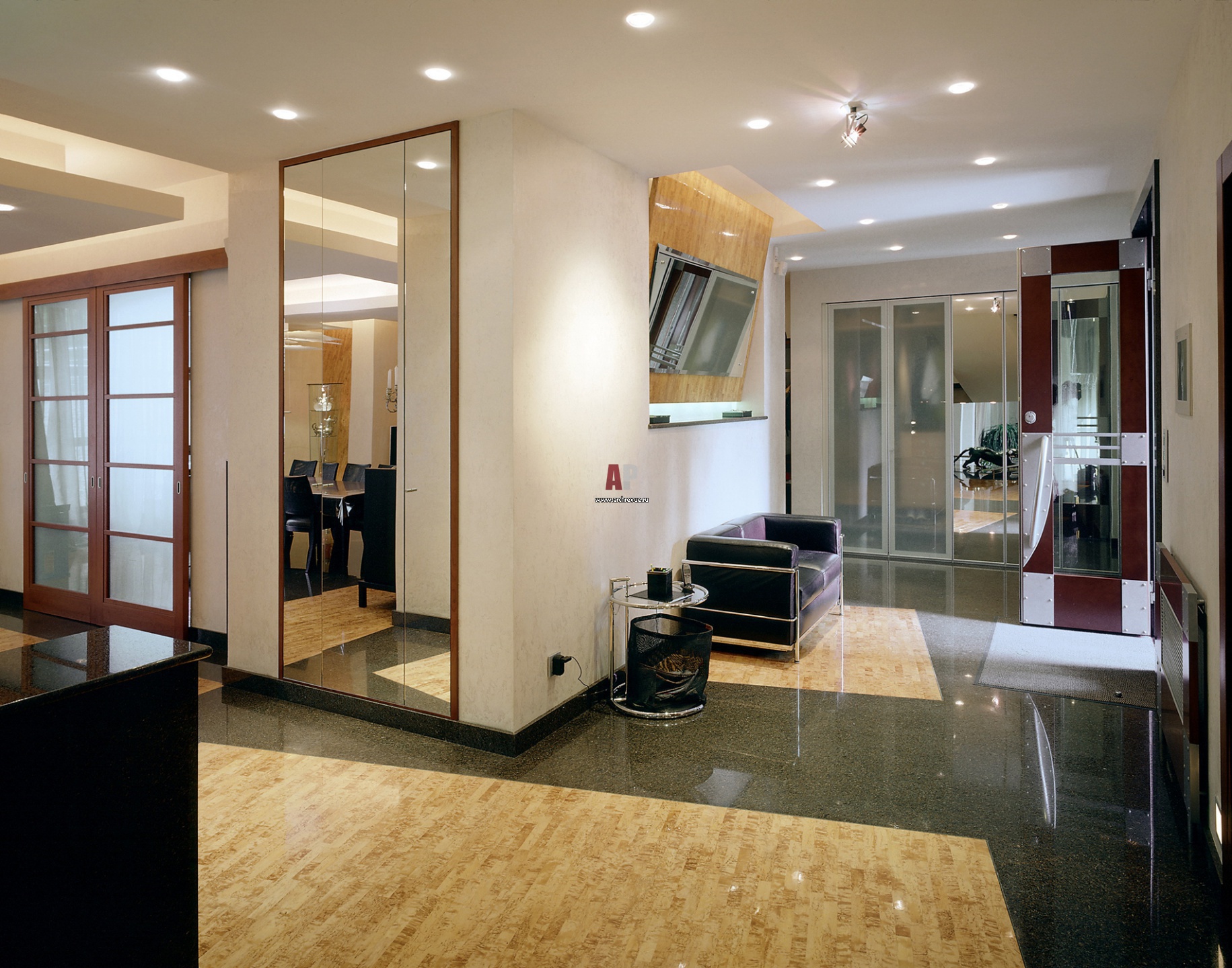 Гардеробная при входе в дом. Деревянный пол со вставками из полированного гранита.