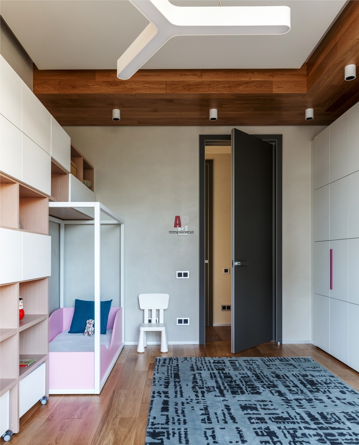 Семейный пентхаус в Хамовниках. Интерьер детской. Кровать и корпусная мебель, Dearkids. Подвесной светильник Xal.