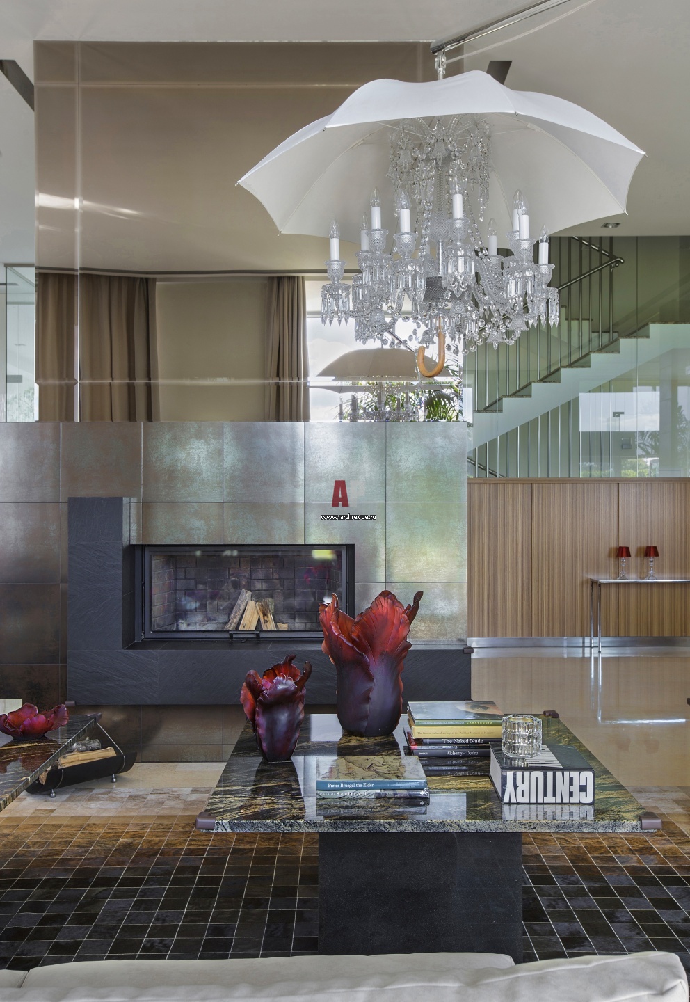 Зона камина в доме с парадной атмосферой. Люстра, Baccarat. Стены зашиты панелями из зебрано.
