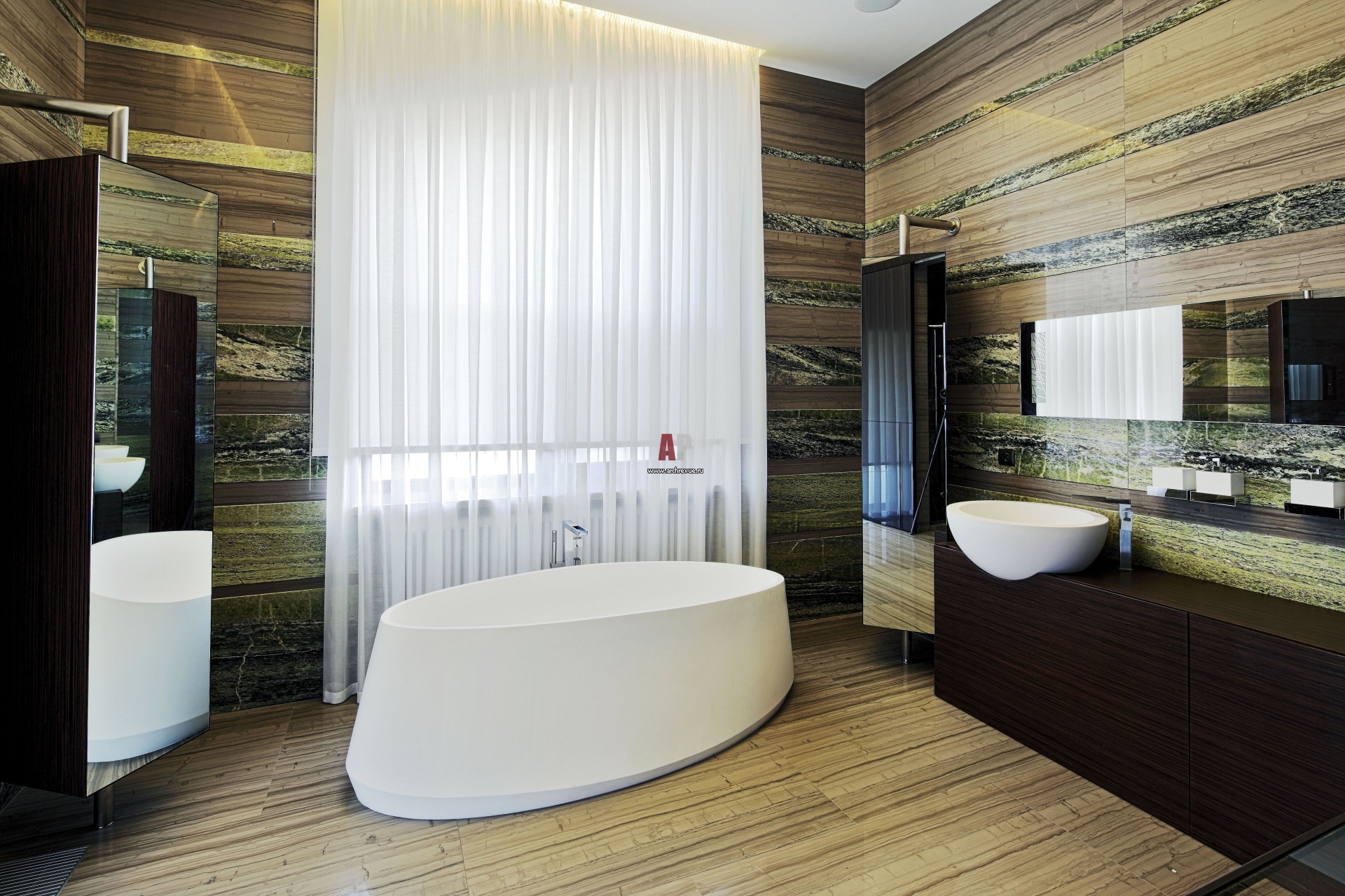 Фото интерьера хозяйской ванной комнаты. В отделке использовано два сорта мрамора: бежевый Serpeggiante Grigio и темно-зеленый Irish Green. Сантехника, Toscoquattro.