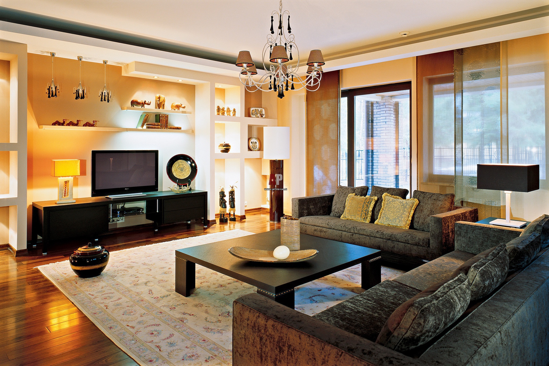 Интерьер зоны домашнего кинотеатра в современном стиле. Окна декорированы раздвижными японскими шторами-ширмами.