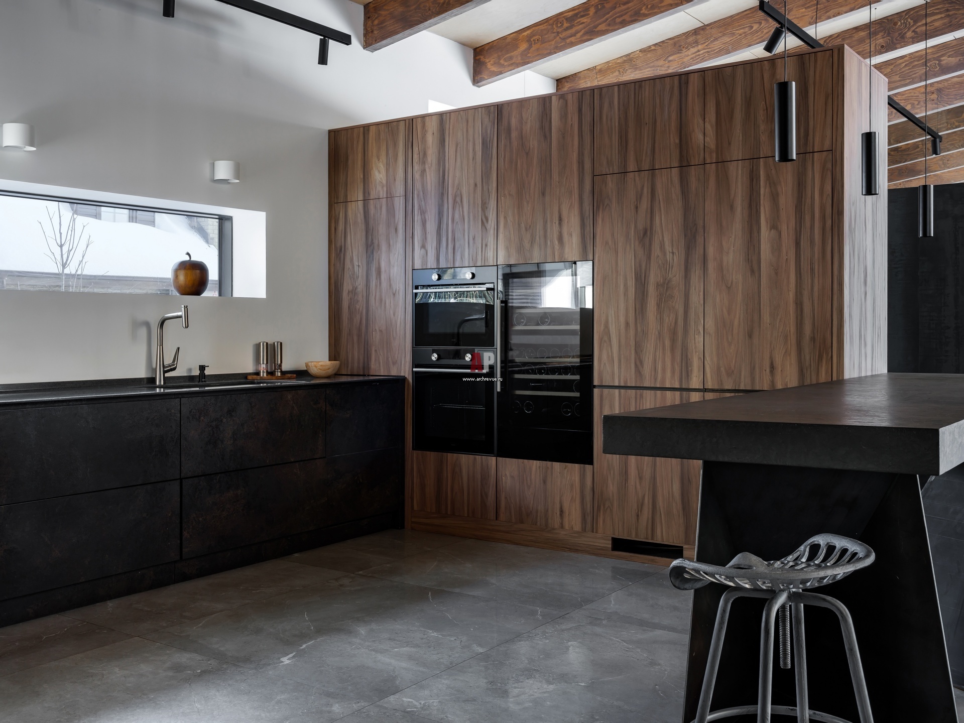 Кухня отделена от гостиной блоком шкафов со встроенной техникой. Шкафы и корпусная мебель специально не довели до потолка, сделав высотой 2,40 м, чтобы сохранить ощущение пространства и воздуха. Фасады выполнены из ЛДСП с достоверной имитацией дерева, а также акрилового камня такого же серого тона, как и основные элементы дома.