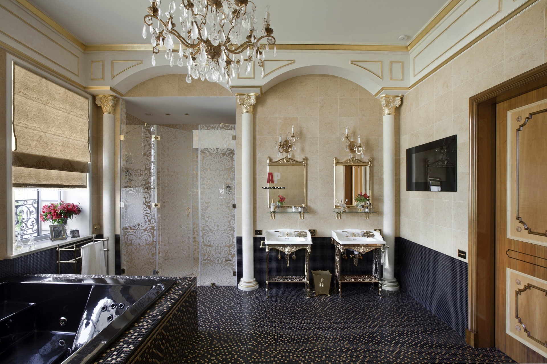 Хозяйская ванная комната оформлена черной с золотом мраморной мозаикой, Petra Antiqua. Стеклянная перегородка душевой украшена пескоструйным орнаментом с «дамасками». Люстра, Schonbek. Зеркала, Chelini. Подстолья под раковины Chadder & Co.