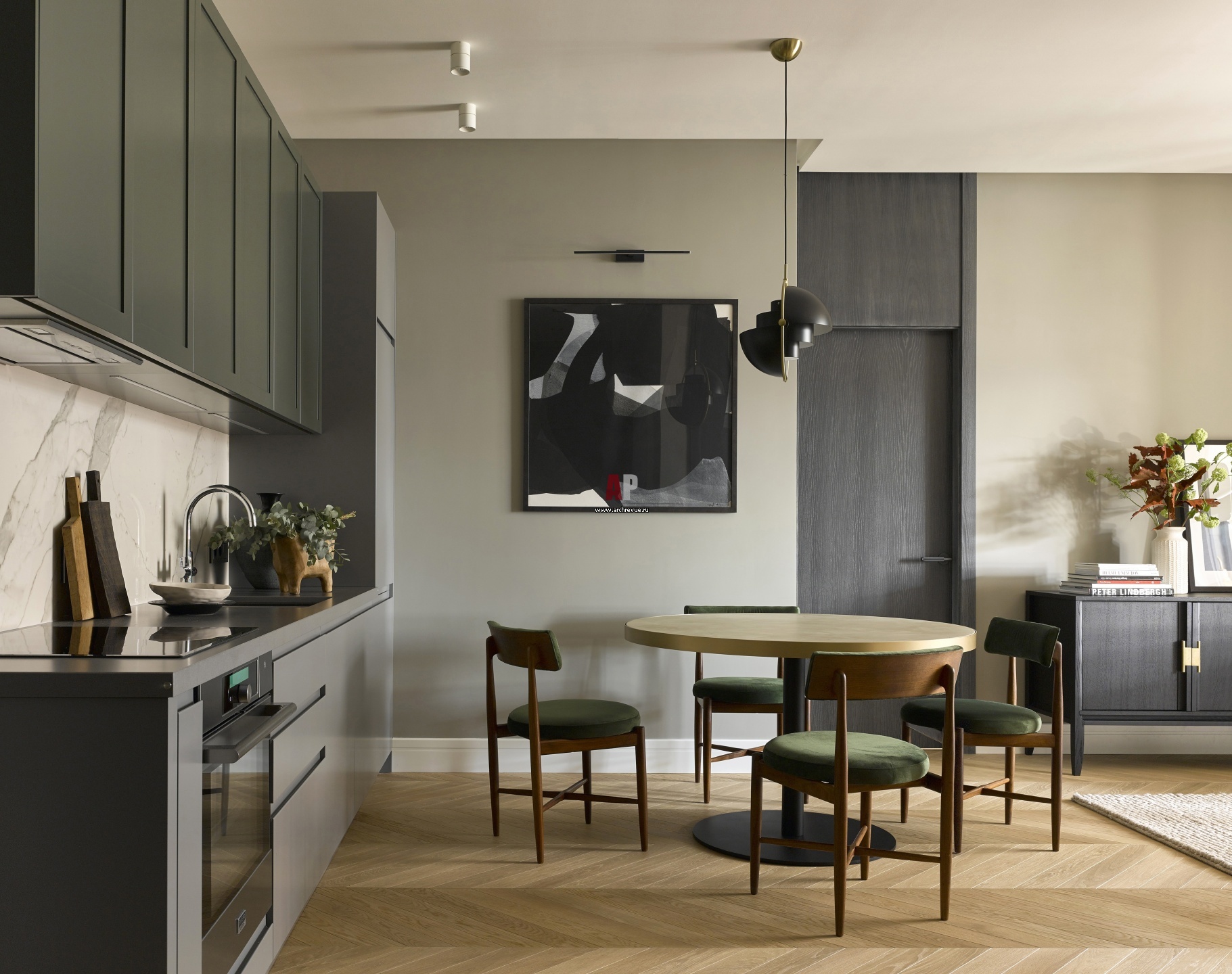 Квартира в серой гамме с болотными стенами. Интерьер кухни-столовой. Обеденный стол, HMD Interiors, круглая столешница из микроцемента с кантом из латуни. Светильник, Gubi, модель Multi-Lite. Дверные ручки, Buster + Punch, поставщик EMPORIO.ru.