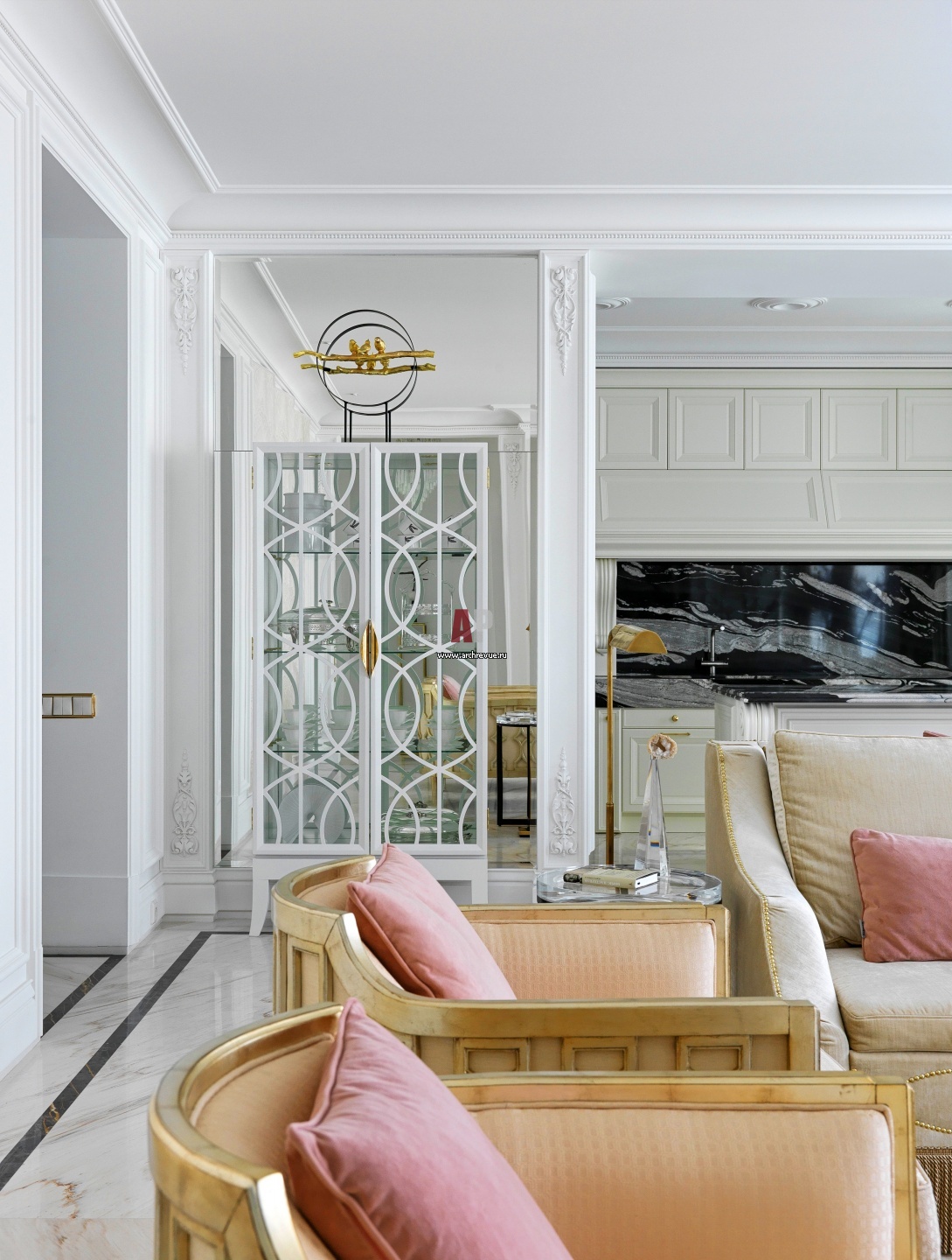 Кухня-столовая отделена от гостиной широким проемом. По бокам от него на фоне зеркальных стен установлены витрины с изящными дверцами.